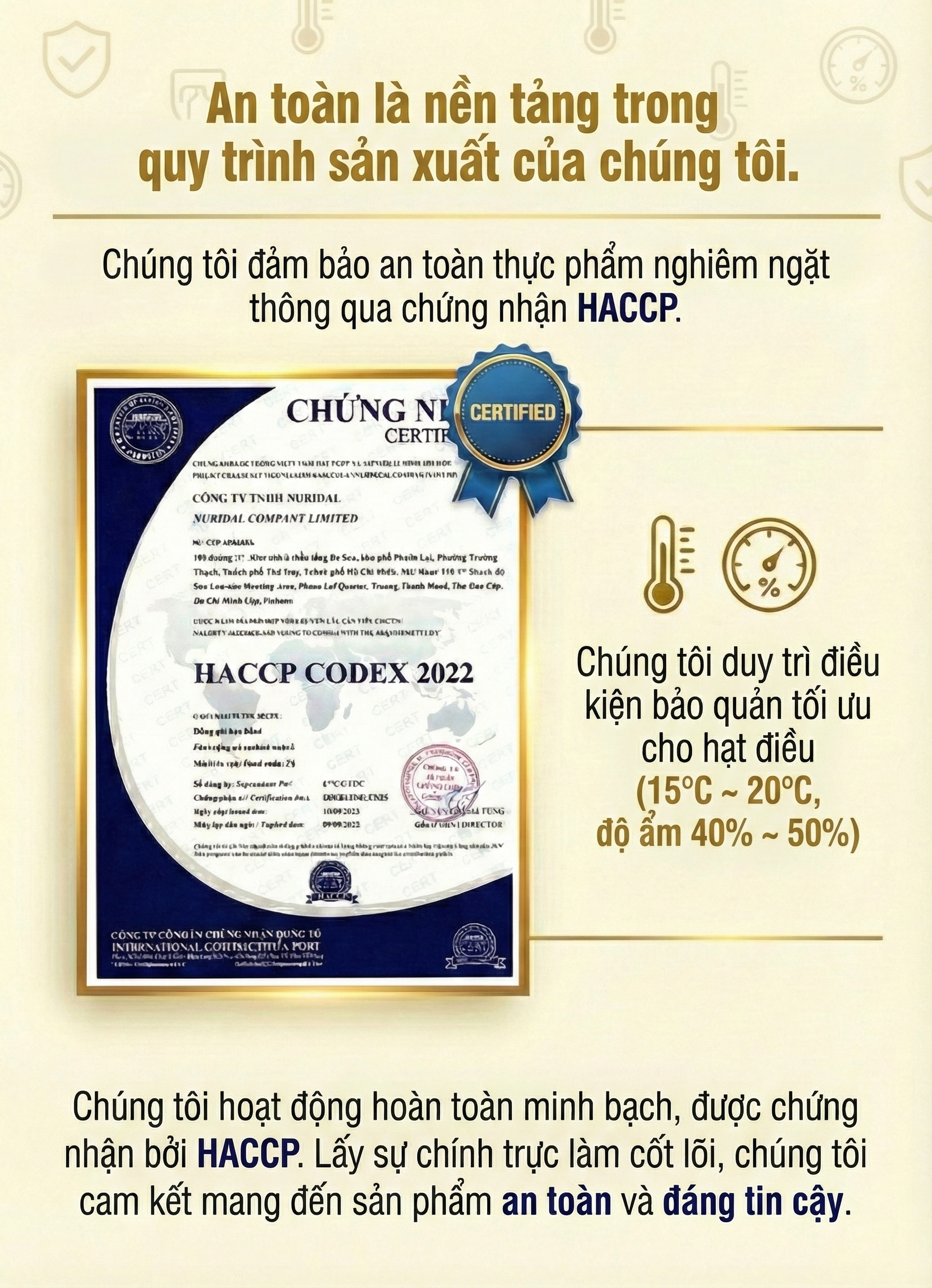 Với sự chính trực, tận tâm và tinh thần chuyên nghiệp, mỗi hạt điều Nuridal bạn thưởng thức đều là minh chứng cho giá trị và cam kết của chúng tôi.