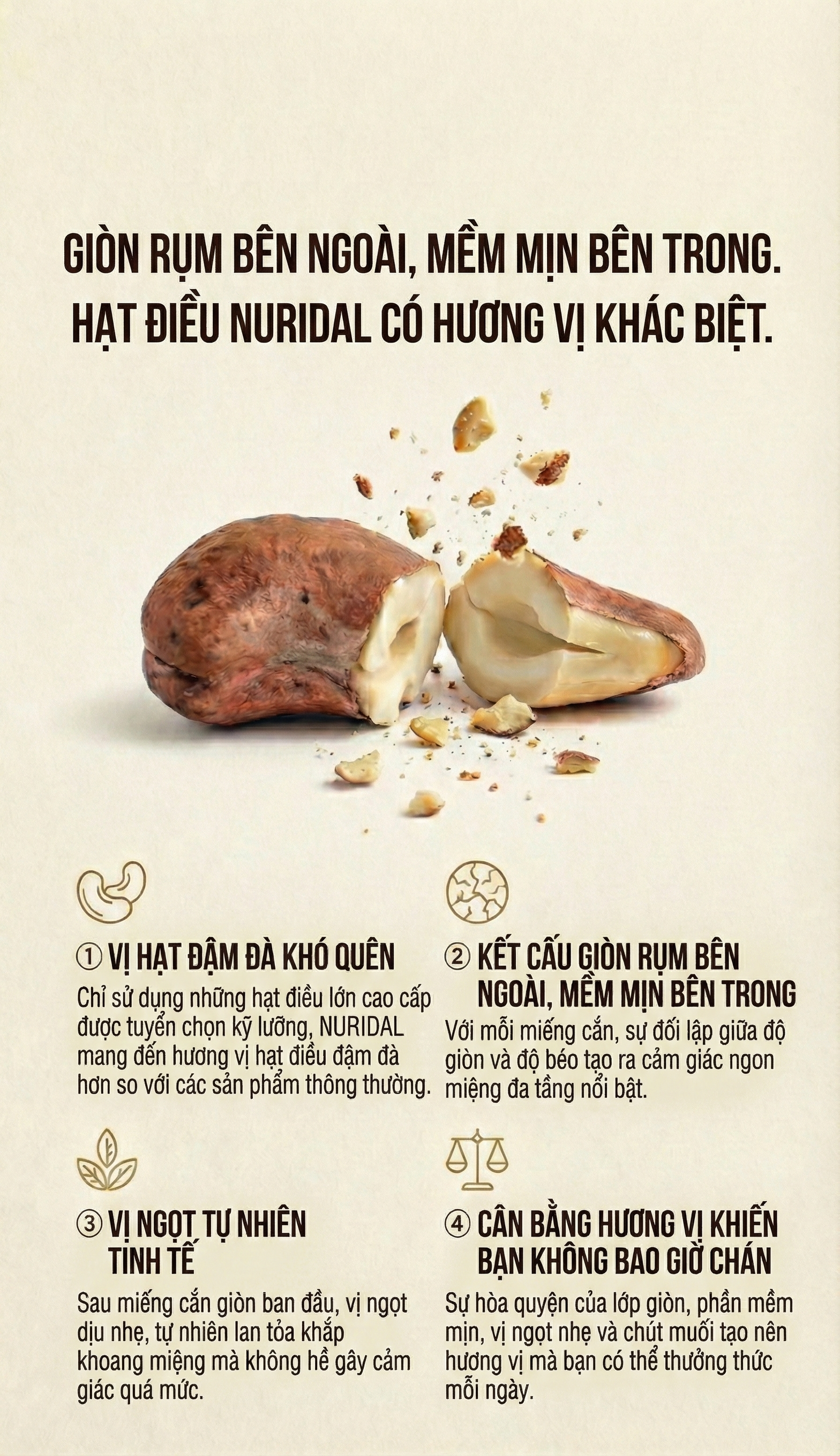 Vị ngọt bùi, béo tự nhiên đặc trưng quyện cùng độ giòn vừa phải-mang đến cho bạn trải nghiệm vị giác khó quên trong từng hạt điều.