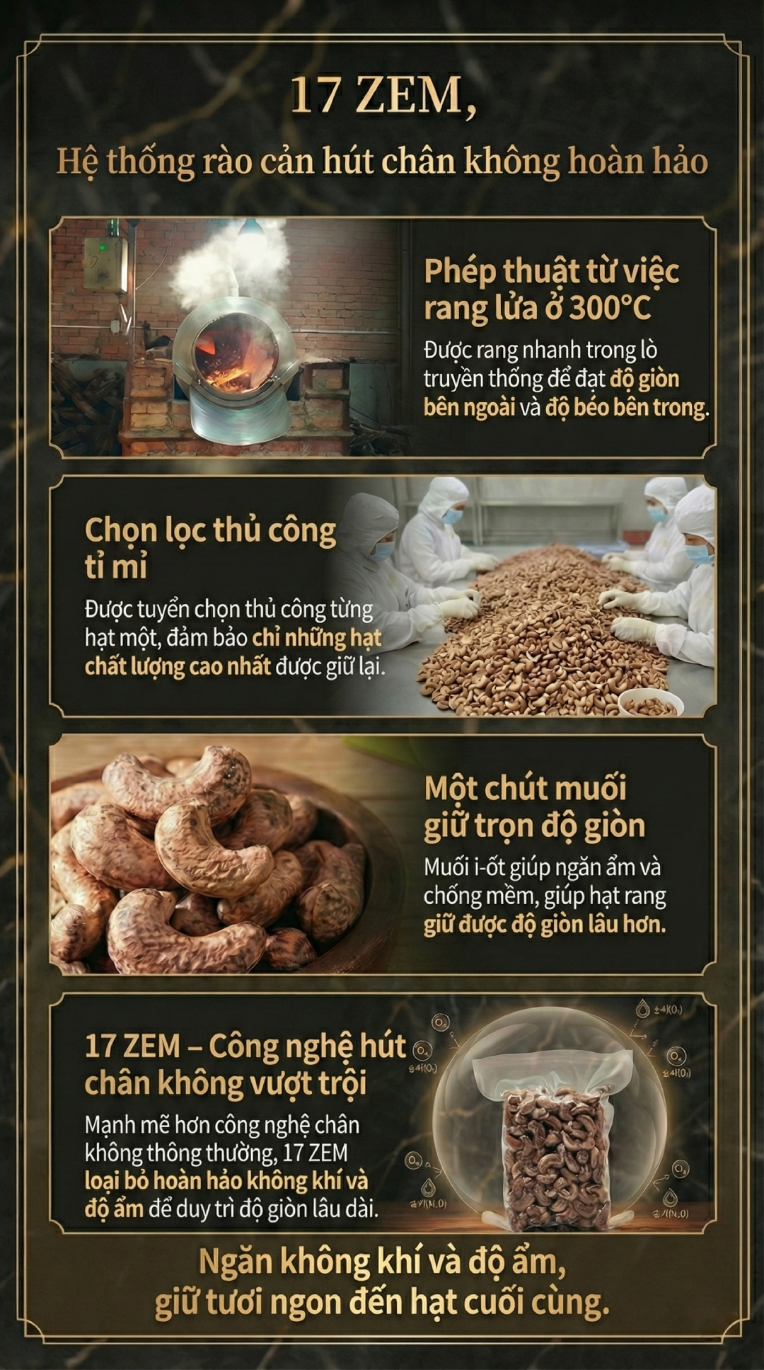 Từng công đoạn từ khâu tuyển chọn hạt đến chế biến được chúng tôi chú trọng một cách tỉ mỉ, để cho ra thành phẩm chất lượng nhất và giữ trọn được hương vị tự nhiên của hạt điều.