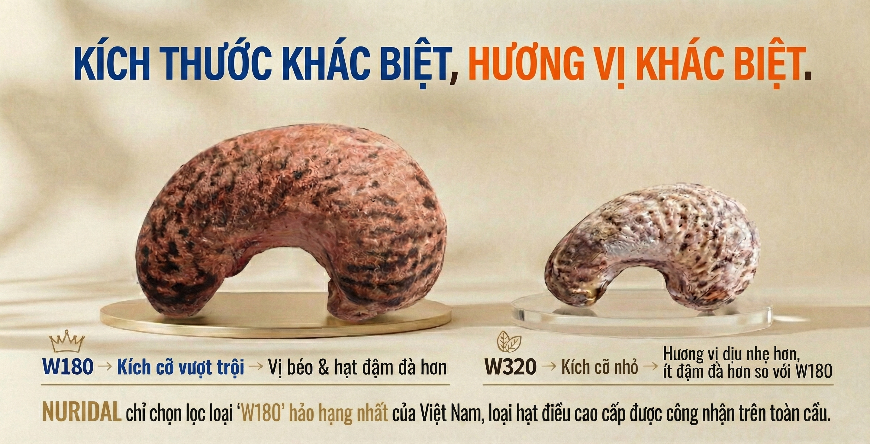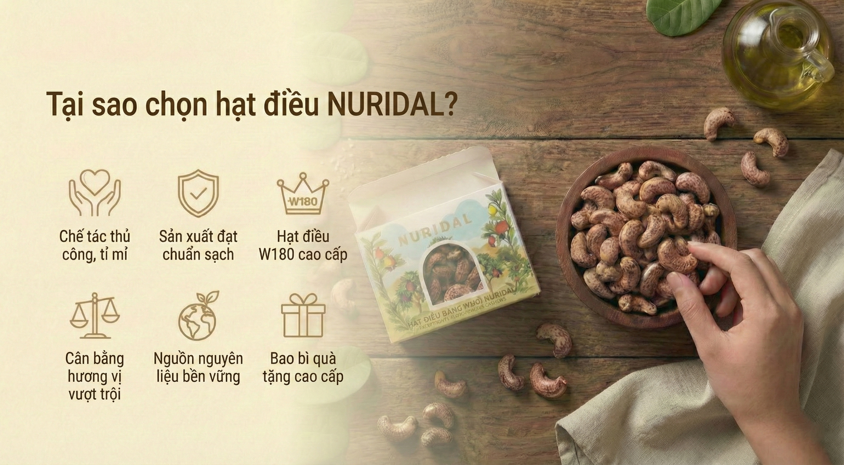 NURIDAL bắt nguồn từ khát vọng chân thành: “Mang hạt điều ngon nhất của Việt Nam lan tỏa khắp thế giới”. Chúng tôi gửi đến bạn những hạt điều được trồng tự nhiên, chọn lọc khéo léo và đóng gói tinh tế.