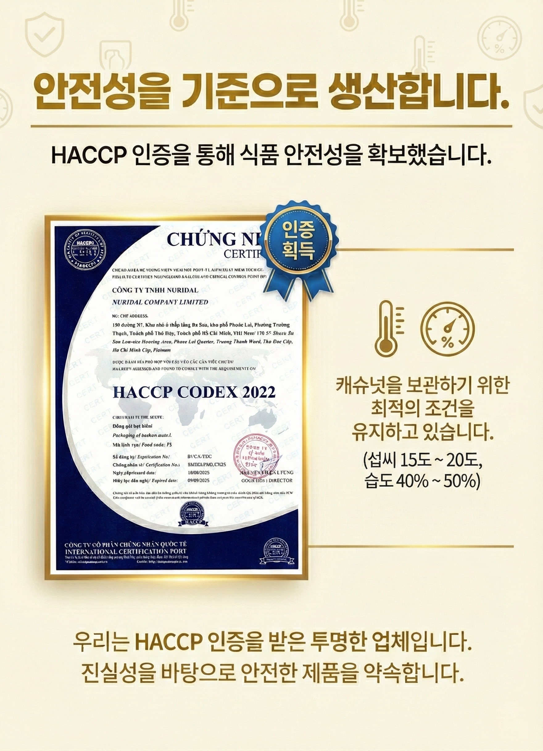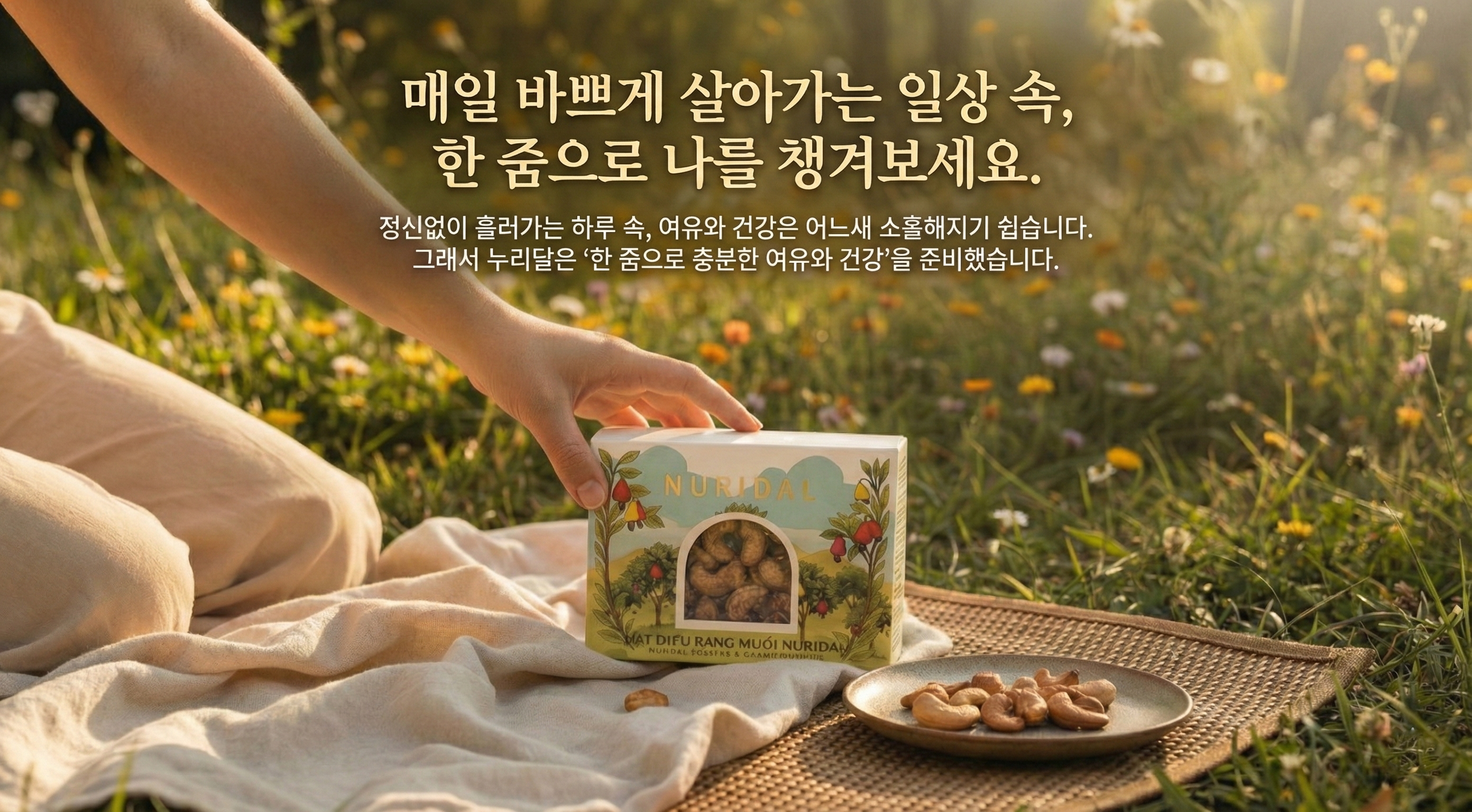 우리 팀은 정직함과 정성, 장인정신으로 일합니다. 여러분이 맛보는 한 알의 NURIDAL 캐슈넛마다 우리의 철학과 약속이 담겨 있습니다.
