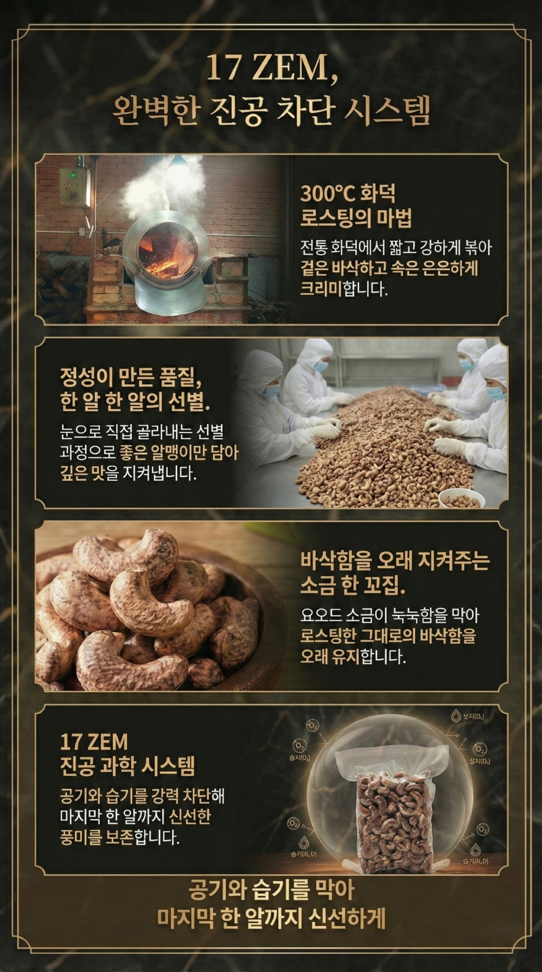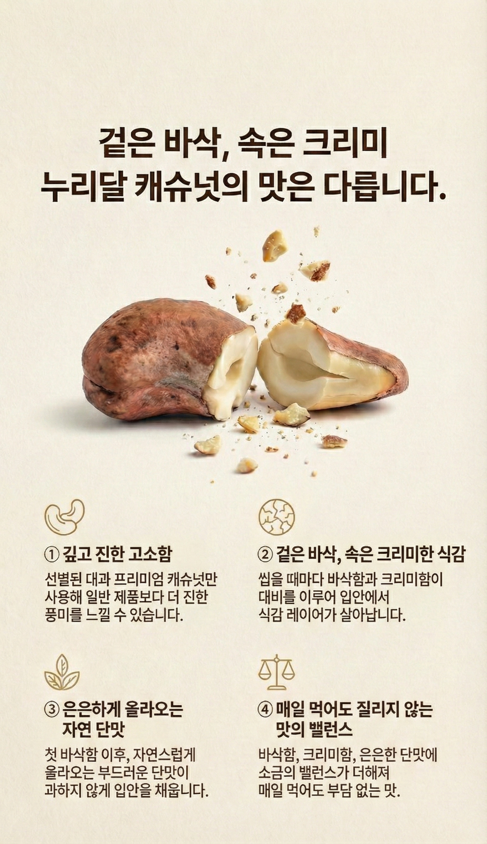 캐슈넛 본연의 크기, 식감, 풍미를 살리기 위해 정밀하게 로스팅하고, 섬세하게 선별합니다.