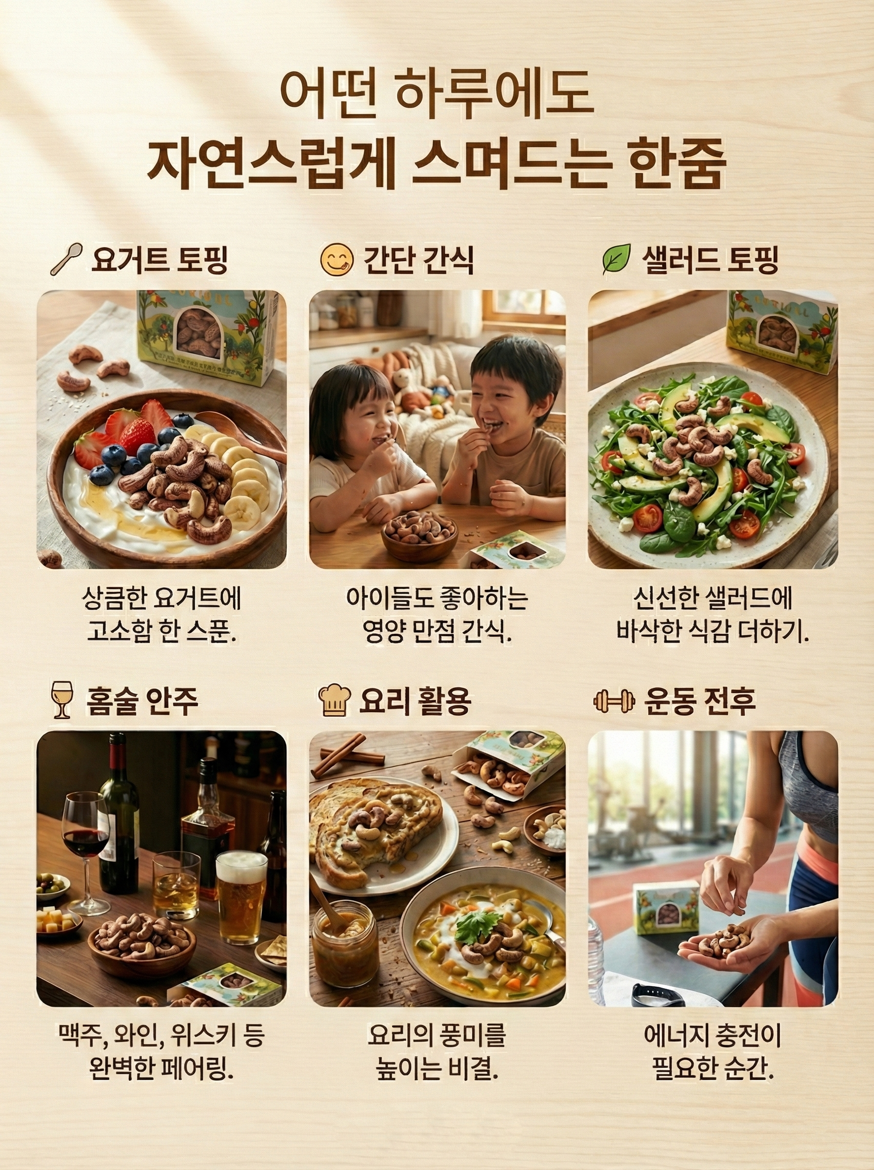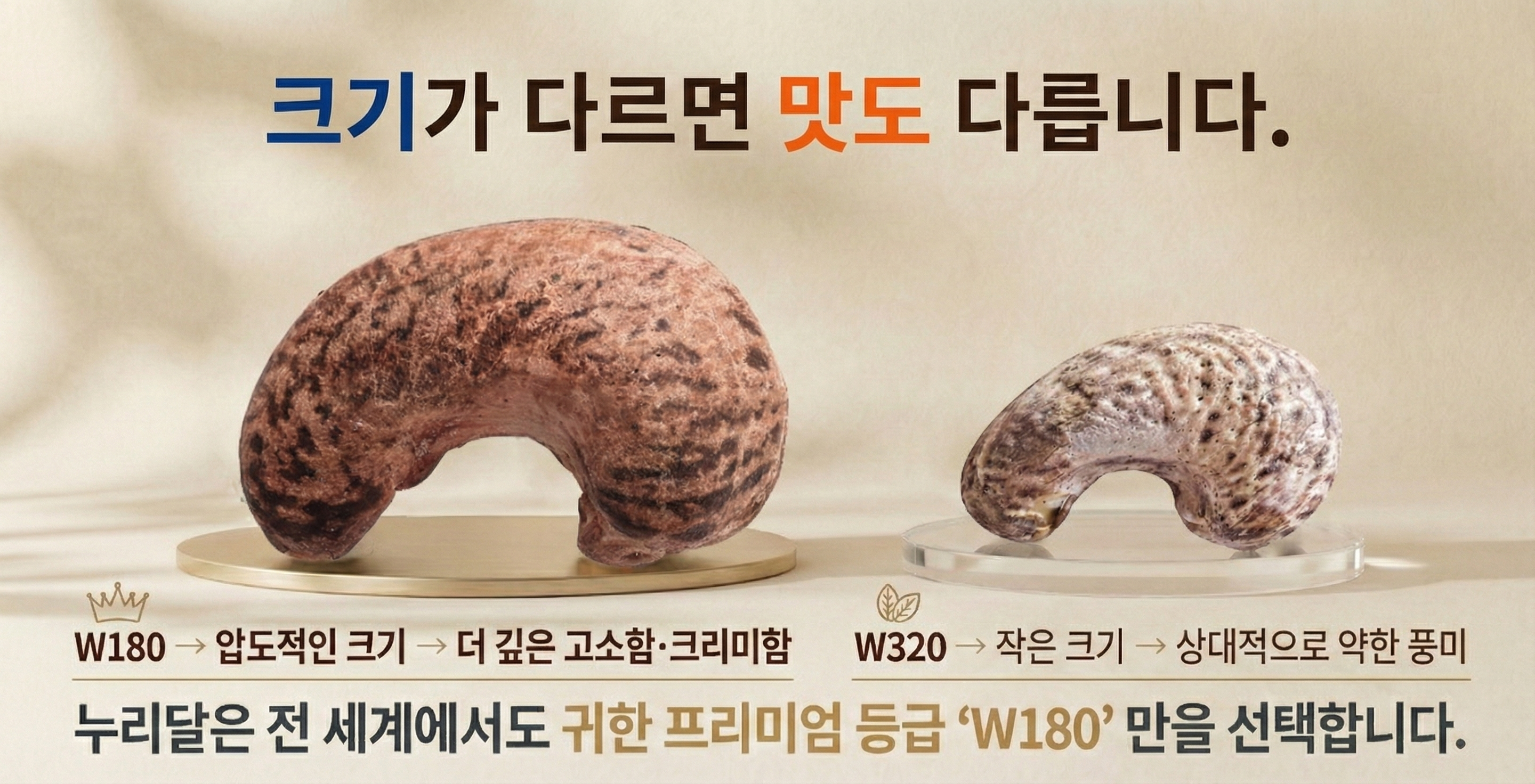 풍부한 크기와 부드러운 식감으로 유명한 W180 통 캐슈넛만을 선별하여 제공합니다. 고급스러운 풍미가 다릅니다.