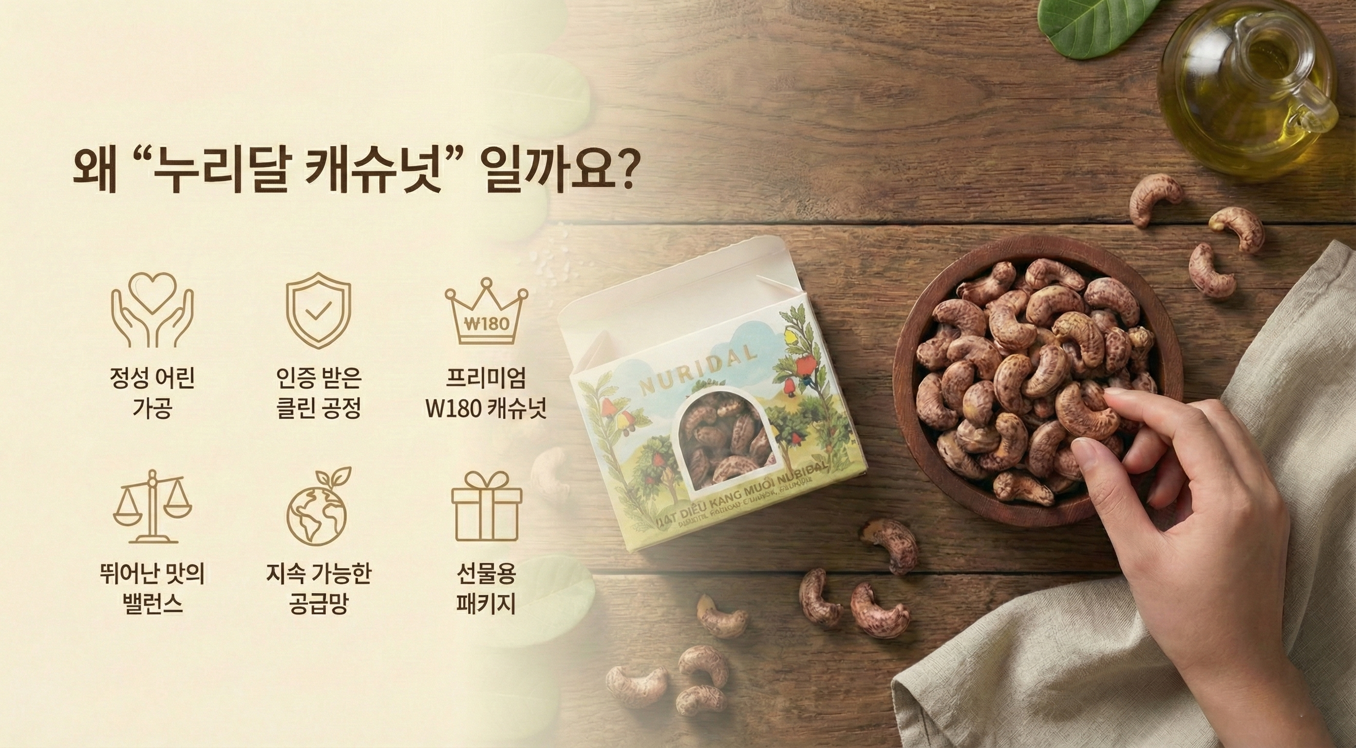 우리 팀은 정직함과 정성, 장인정신으로 일합니다. 여러분이 맛보는 한 알의 NURIDAL 캐슈넛마다 우리의 철학과 약속이 담겨 있습니다.